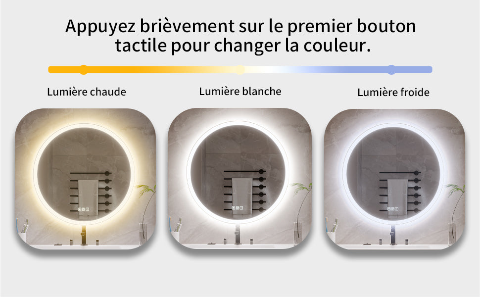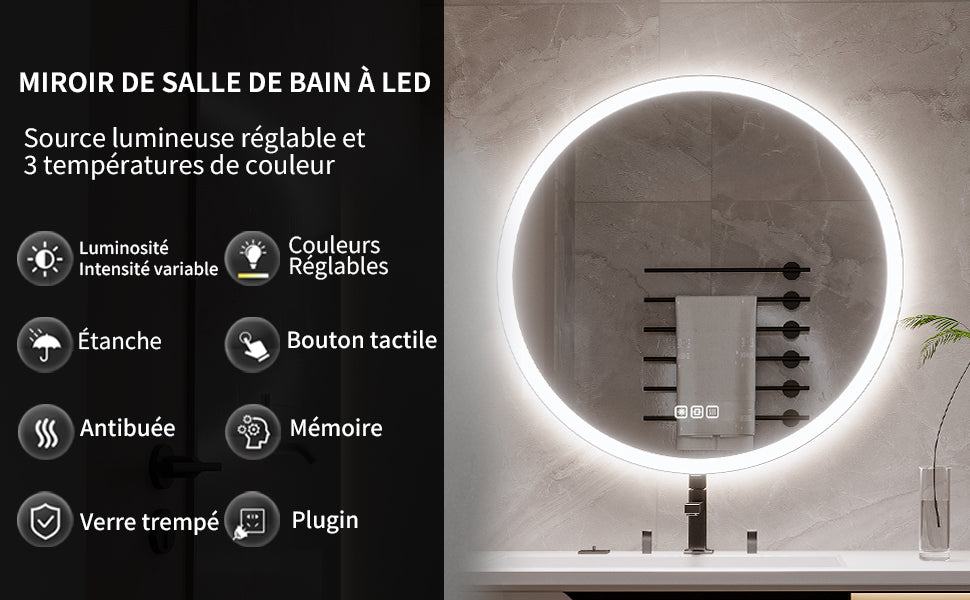 Miroir LED 50 x 50 cm, rond, anti-buée, dimmable, 3 couleurs, éclairage avant et arrière, CRI 90+, miroir mural en verre trempé HD IP44, bouton tactile, horizontal/vertical.